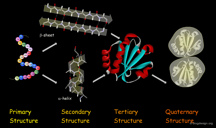 Secondary Structure: Local folding into α-helices, β-sheets, and turns/loops stabilized by backbone hydrogen bonds.